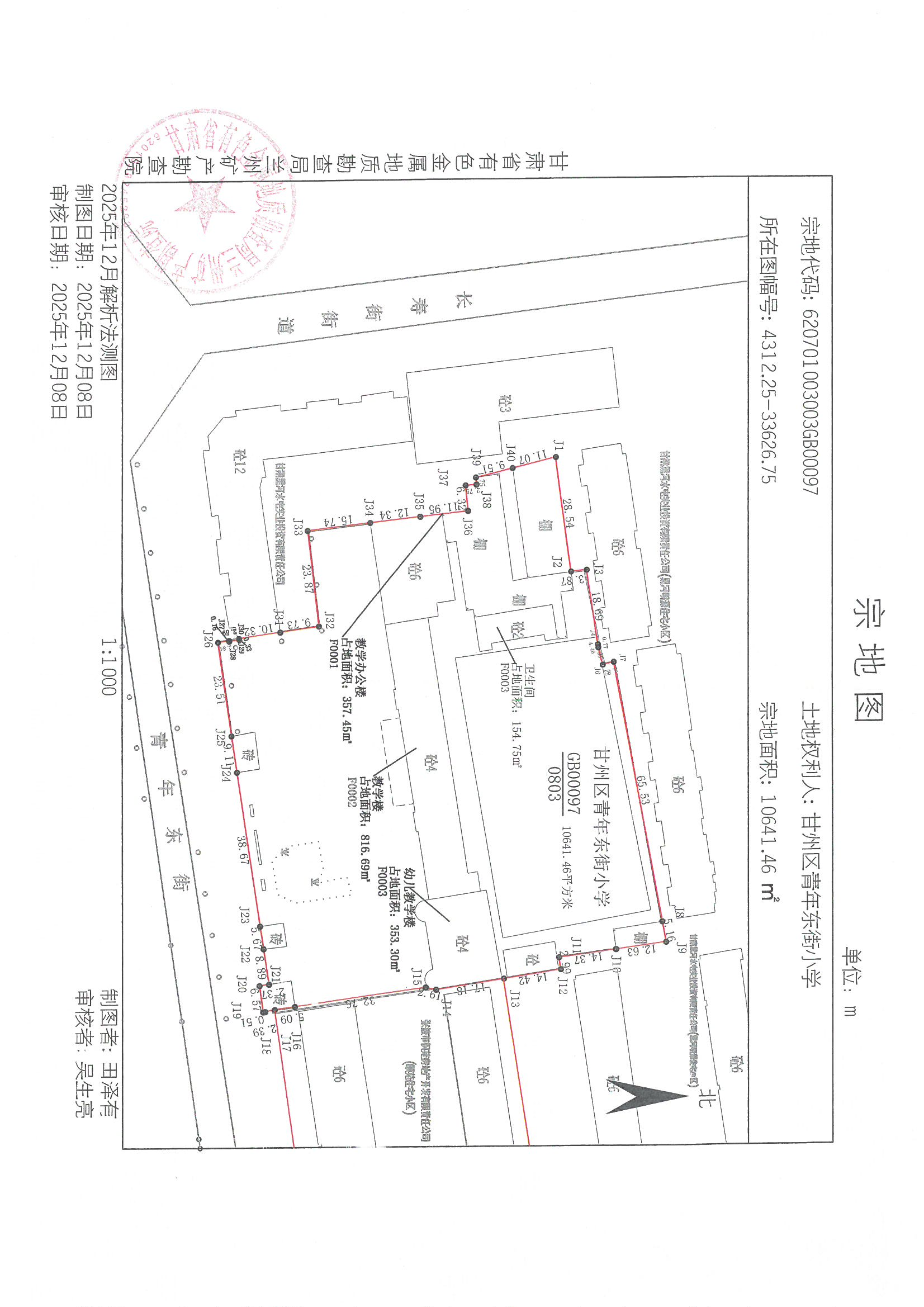 宗地位于甘州區(qū)青年?yáng)|街140號(hào),宗地面積10641.46平方米,規(guī)劃及實(shí)際用途為教育用地。根據(jù)《中共張掖市委辦公室 張掖市人民政府辦公室關(guān)于印發(fā)張掖市市級(jí)黨政機(jī)關(guān)事業(yè)單位不動(dòng)產(chǎn)權(quán)屬統(tǒng)一登記工作實(shí)施方案的通知》(市委辦字〔2023〕69號(hào))要求,市機(jī)關(guān)事務(wù)局委托第三方進(jìn)行地籍調(diào)查形成了《地籍調(diào)查表》,權(quán)利人為甘州區(qū)青年?yáng)|街小學(xué),使用權(quán)類型為劃撥,用途為教育用地。