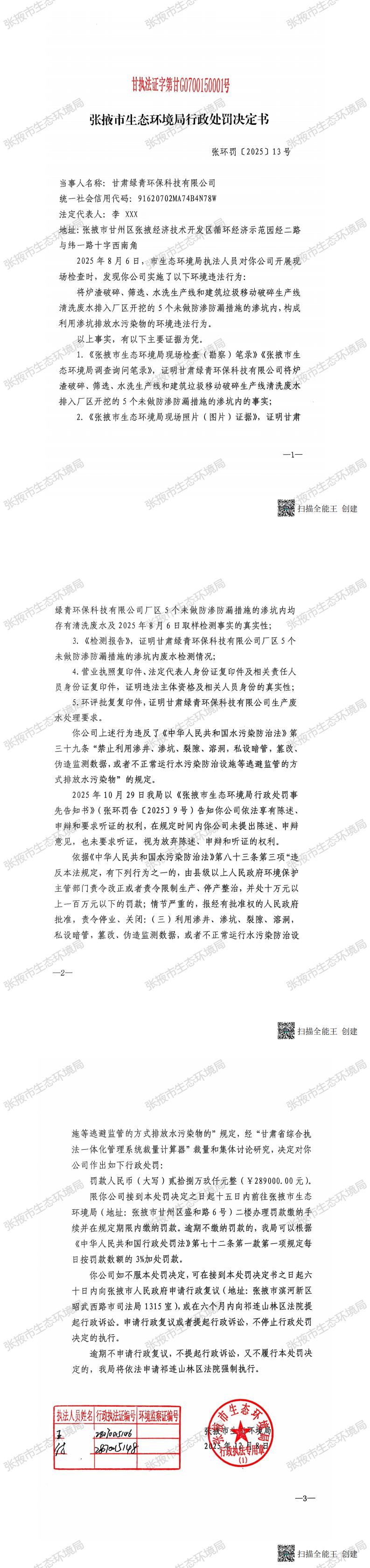 張掖市生態(tài)環(huán)境局行政處罰決定書(張環(huán)罰【2025】13號)