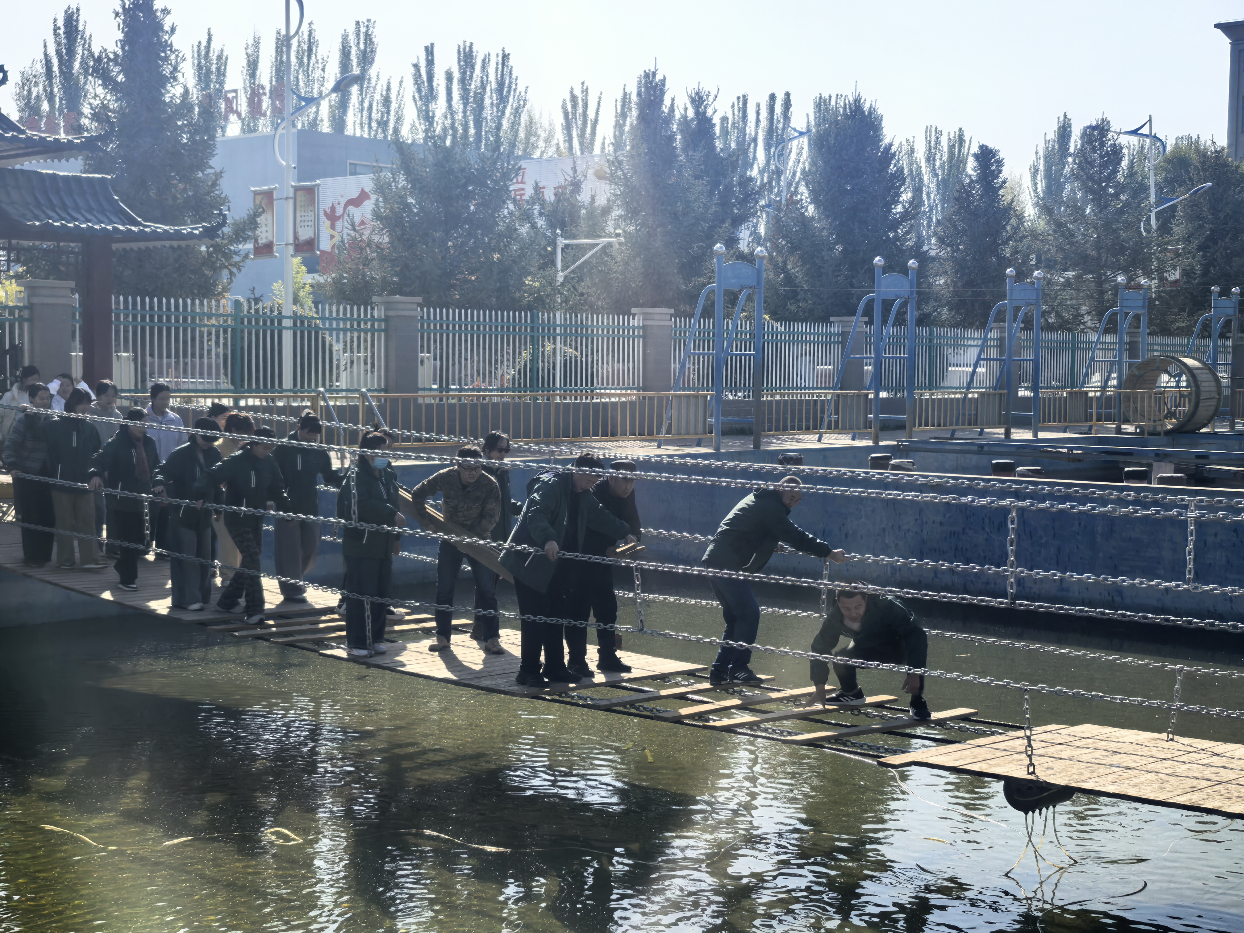 當天上午,全體教職工來到綜合實踐基地,先后參觀了生命與科技實踐區(qū)、手工技能區(qū)及張掖市國防園等主題功能區(qū),詳細了解現(xiàn)代科技賦能教育事業(yè)發(fā)展的創(chuàng)新成果,深入感受我國國防建設的發(fā)展歷程與重要成就。素質(zhì)拓展中,老師們熱情投入“飛奪瀘定橋”“水上蕩橋”等項目。面對搖晃的索橋,大家群策群力,互相鼓勵,讓團隊協(xié)作的力量愈發(fā)凸顯。尤其在“飛奪瀘定橋”項目中,老師們互相配合踩著晃動木板前進,在攜手共渡難關中深化了信任與凝聚力。