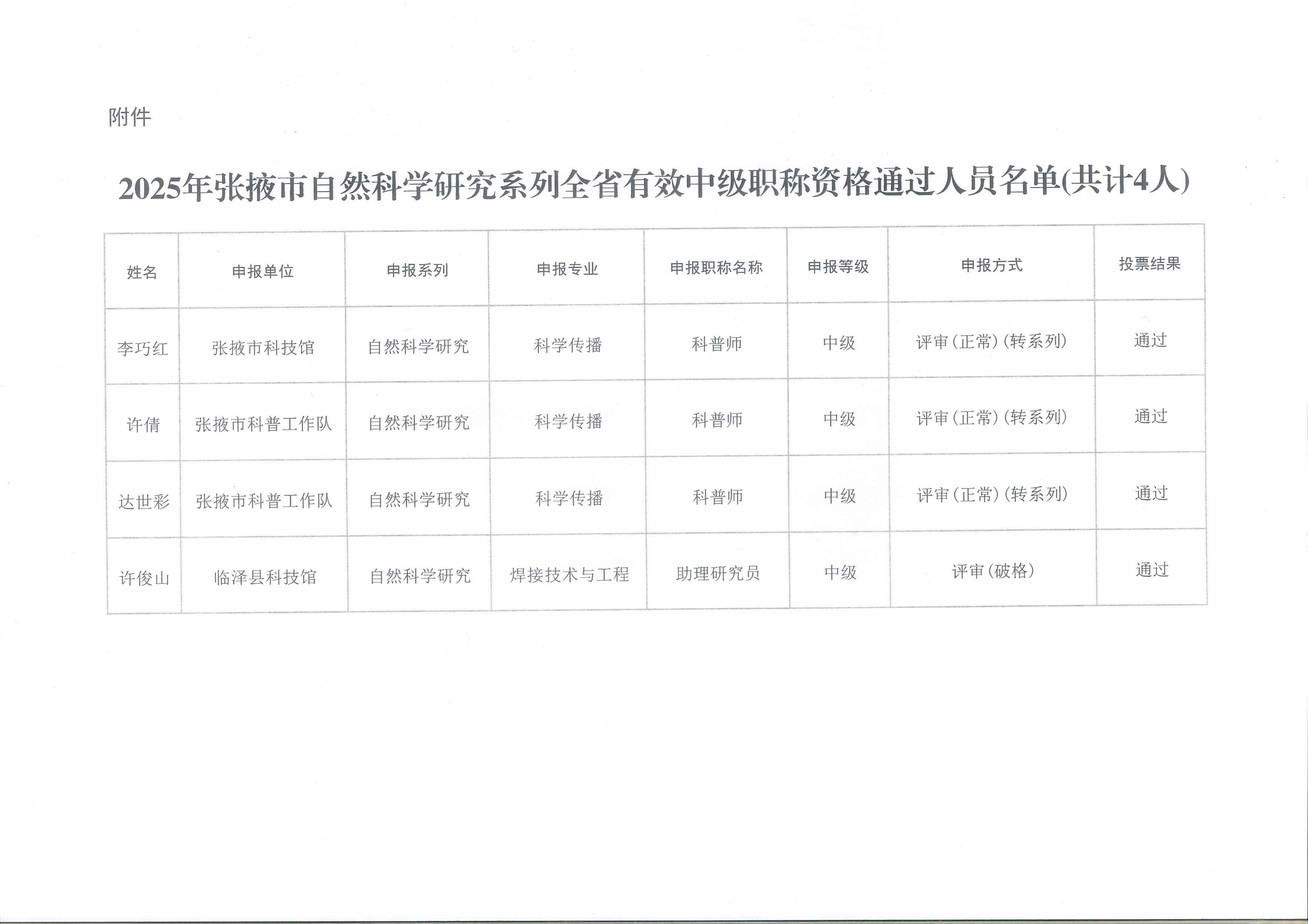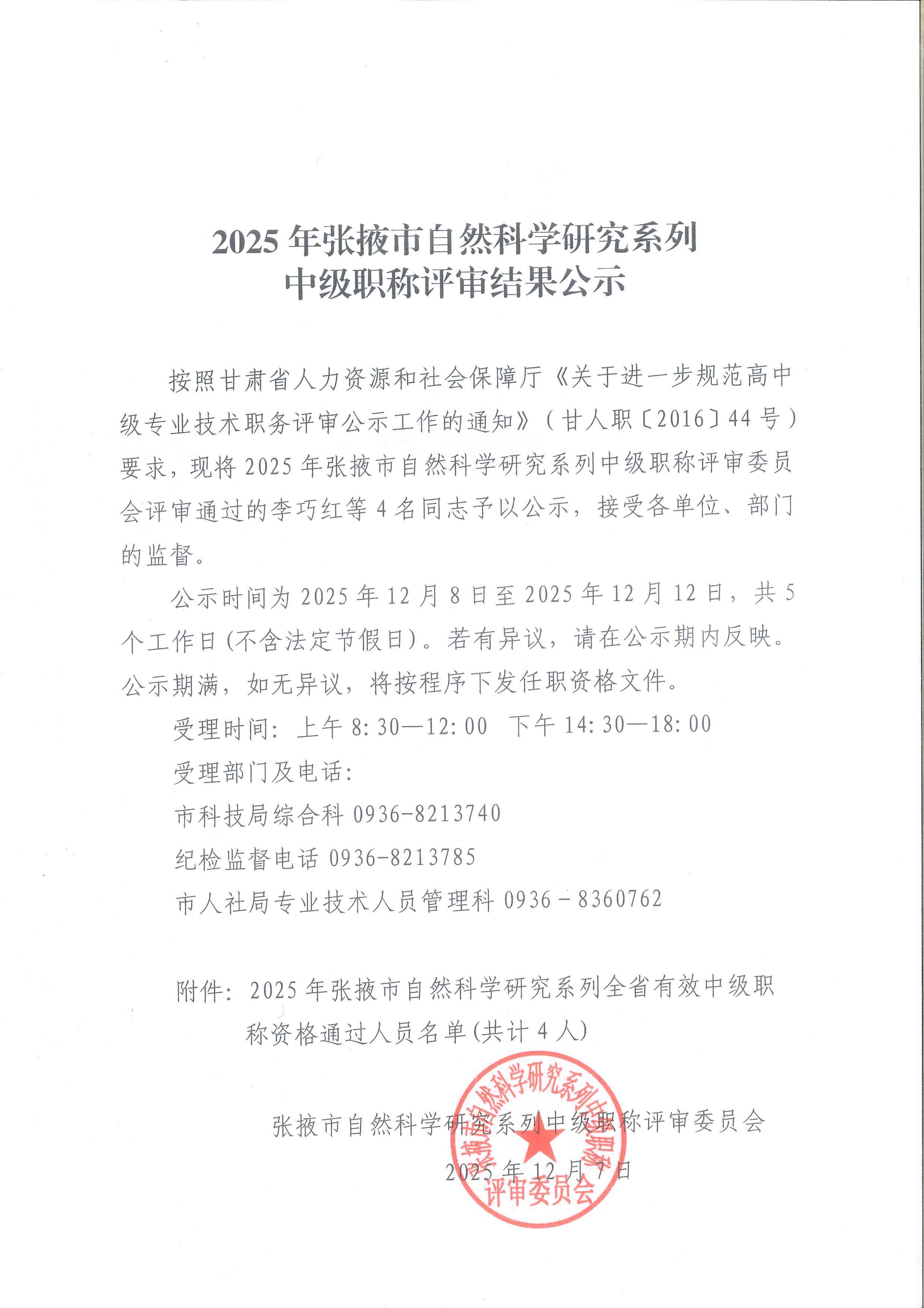2025年張掖市自然科學(xué)研究系列中級職稱評審結(jié)果公示