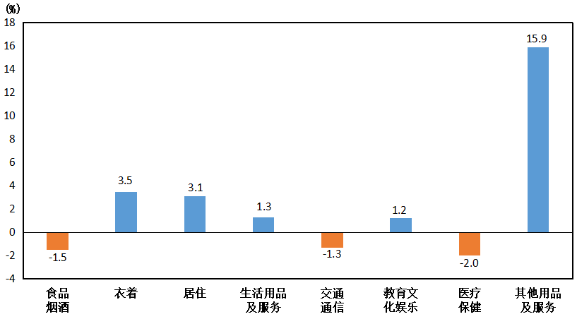 其他七大類價格同比“降”。其中,其他用品及服務價格上漲15.9%,衣著價格上漲3.5%,居住價格上漲3.1%,生活用品及服務類價格上漲1.3%,教育文化娛樂價格上漲1.2%;醫(yī)療保健價格下降2.0%,交通通信價格下降1.3%