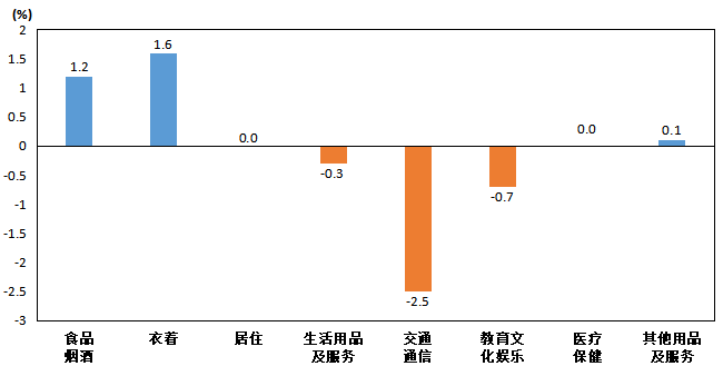 其他七大類價格環(huán)比“降二平”。其中,衣著價格上漲1.6%,其他用品及服務價格上漲0.1%;交通通信價格下降2.5%,教育文化娛樂價格下降0.7%,生活用品及服務價格下降0.3%;居住、醫(yī)療保健價格持平。