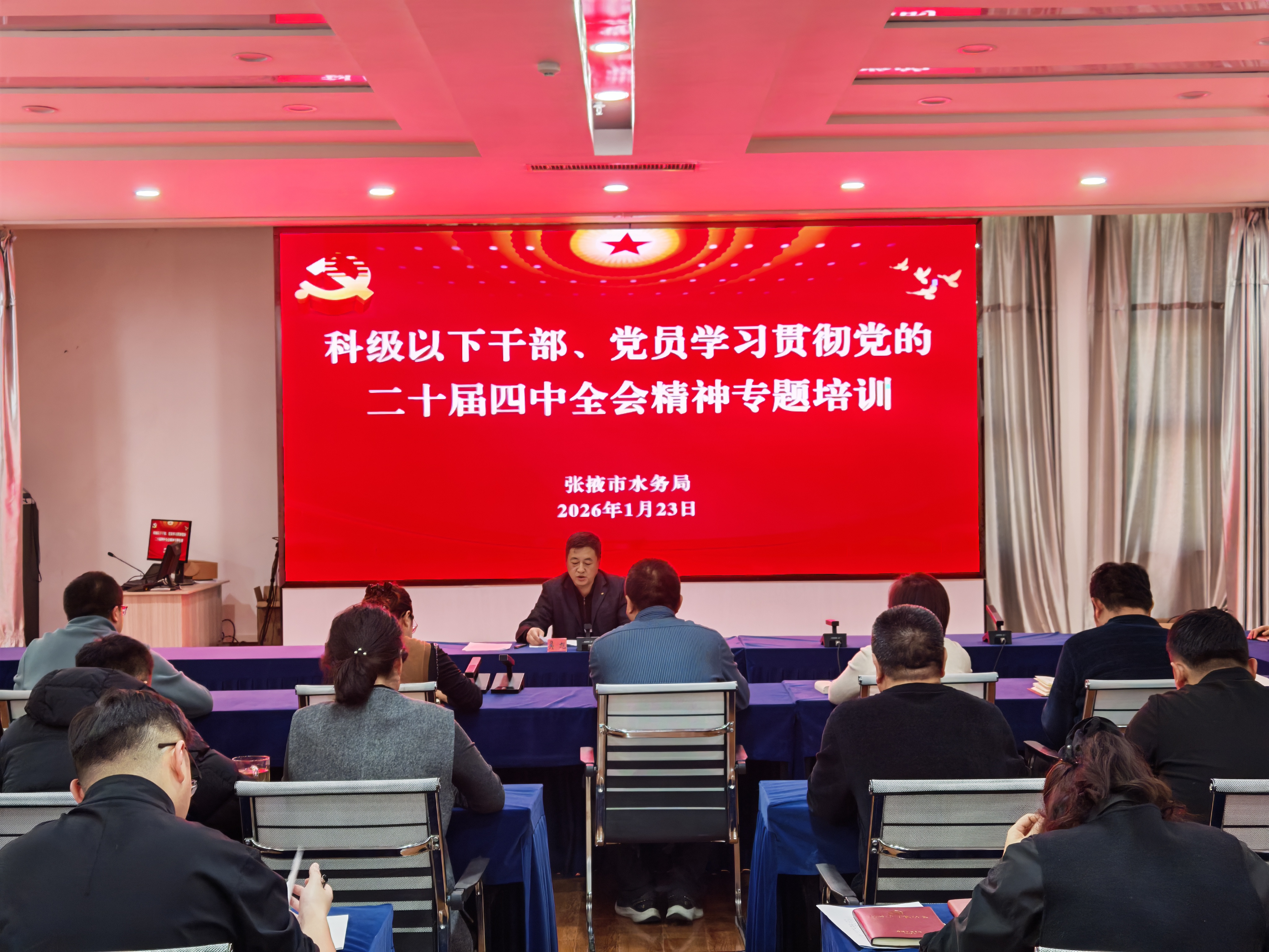 為深入學(xué)習(xí)貫徹黨的二十屆四中全會(huì)精神,引導(dǎo)全局干部黨員深刻領(lǐng)會(huì)全會(huì)核心要義與實(shí)踐要求,切實(shí)把思想和行動(dòng)統(tǒng)一到黨中央決策部署上來。1月23日下午,市水務(wù)局舉辦科級(jí)以下干部、黨員學(xué)習(xí)貫徹黨的二十屆四中全會(huì)精神專題培訓(xùn)開班式并組織首次集中學(xué)習(xí)。局黨組成員、機(jī)關(guān)黨委書記吳旭出席開班式并講話。