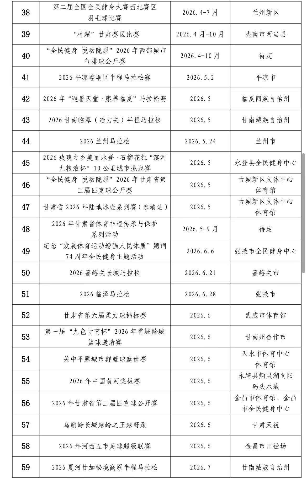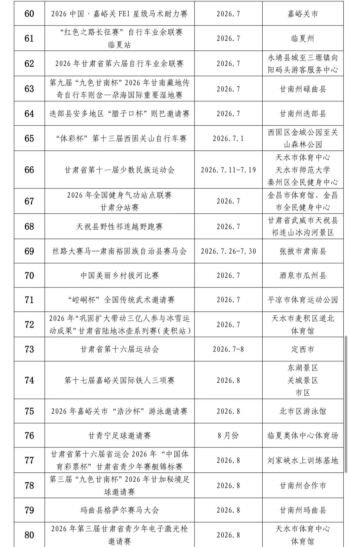 近日,省體育局、省文旅廳聯(lián)合發(fā)布了2026“跟著賽事游甘肅”100項(xiàng)體育賽事目錄。我市2025-2026全國大眾室外速度滑冰挑戰(zhàn)賽(甘肅站)、2026年臨澤縣冰雪嘉年華活動(dòng)、“雪舞黑河·樂游高臺”——2026高臺冬季冰雪嘉年華、紀(jì)念“發(fā)展體運(yùn)動(dòng)增強(qiáng)人民體質(zhì)”題詞74周年全民健身主題活動(dòng)、2026臨澤馬拉松、絲路大賽馬——2肅南裕固族自治縣賽馬會(huì)、“紅色之路長征賽”自行車聯(lián)賽(張掖站)、2026張掖黑河半程馬拉松、2026年“雙11”全國持杖行走聯(lián)動(dòng)日(張掖站)活動(dòng)等9項(xiàng)賽事活動(dòng)入選,數(shù)量位居全省第三。(田金順)