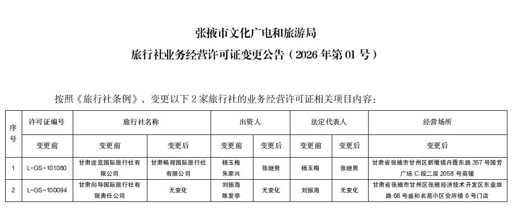 張掖市文化廣電和旅游局旅行社業(yè)務(wù)經(jīng)營(yíng)許可證變更公告(2026年第01號(hào))