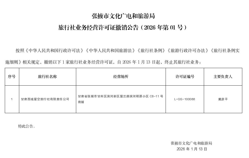 張掖市文化廣電和旅游局旅行社業(yè)務經(jīng)營許可證撤銷公告(2026年第01號)