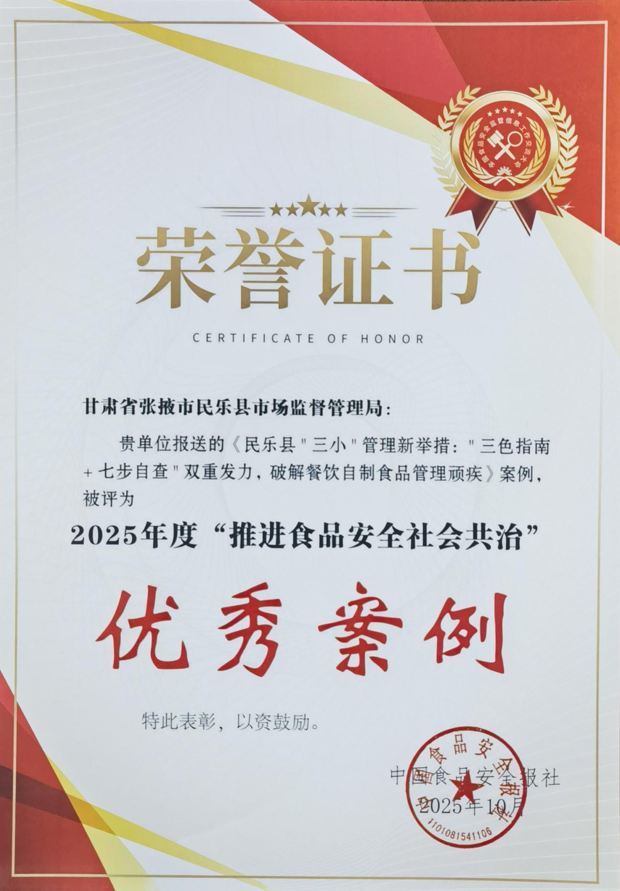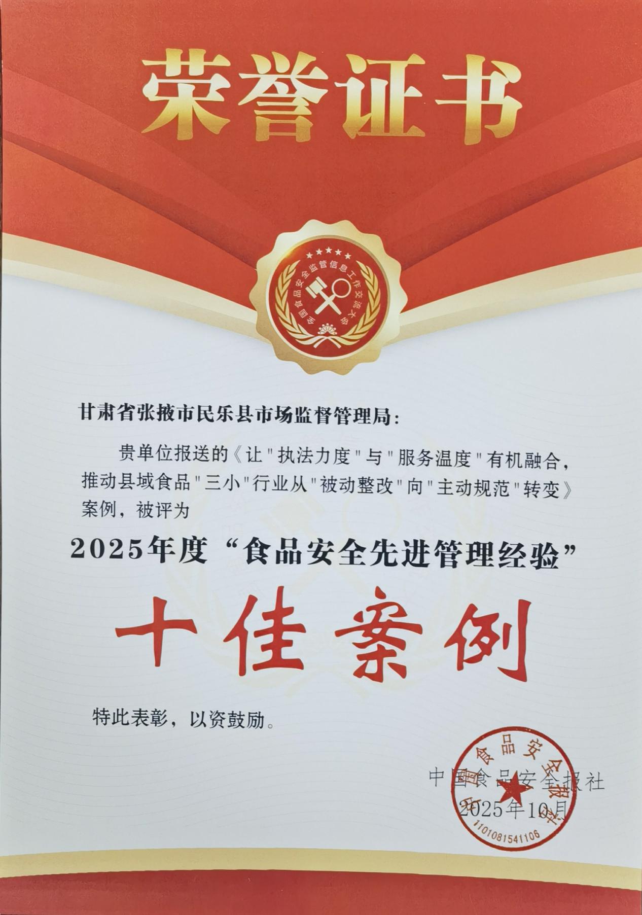 近日,在新疆召開的第十二屆全國食品安全監(jiān)管信息工作交流大會上,由我院選派至民樂縣市場監(jiān)督管理局掛職工作的于喆源同志主持報送的《讓“執(zhí)法力度”與“服務(wù)溫度”有機融合,推動縣域食品“三小”行業(yè)從“被動整改”向“主動規(guī)范”轉(zhuǎn)變》案例,經(jīng)過層層遴選,從全國近200個治理案例中脫穎而出,榮獲“2025食品安全先進管理經(jīng)驗十佳案例”,同時報送的《民樂縣“三小”管理新舉措:“三色指南+七步自查”雙重發(fā)力,破解餐飲自制食品管理頑疾》榮獲“2025年度推進食品安全社會共治優(yōu)秀案例”。該榮譽不僅是我院干部專業(yè)能力的生動體現(xiàn),更是我院長期以來扎實推進人才隊伍建設(shè)的顯著成果。