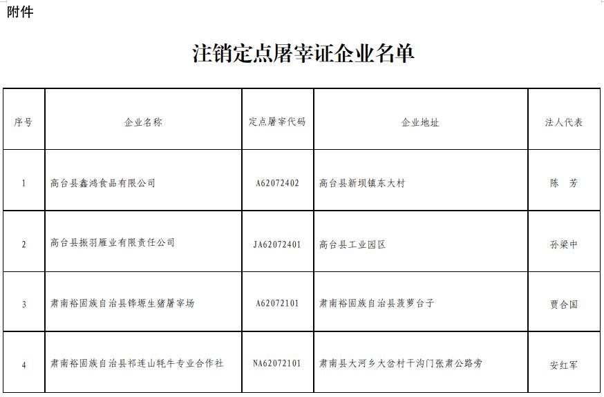 一、同意注銷高臺縣鑫鴻食品有限公司等4家企業(yè)定點屠宰證書(具體名單見附件)。